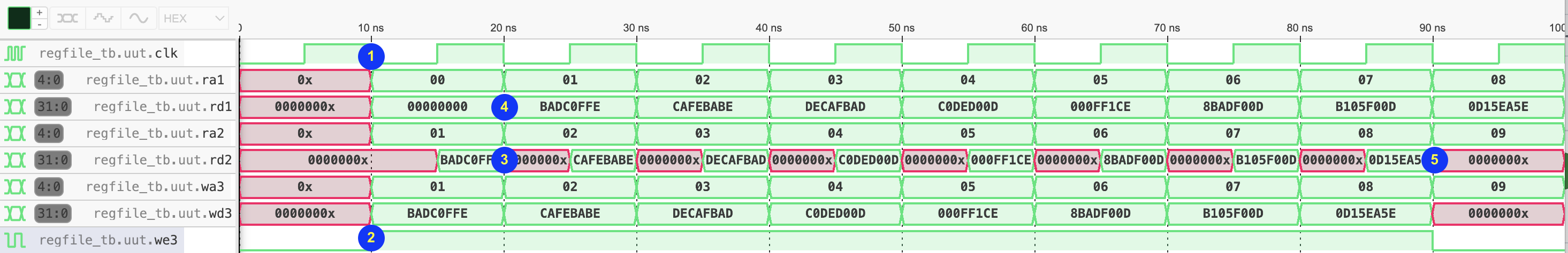 O objetivo desta simulação é escrever um test bench para testar o banco de registradores do RISC-V. Ele possui duas portas de leitura (1 e 2) e uma de escrita (3), totalmente independentes. Para fazer as leituras, são informados os endereços ra1 e ra2 (r*ead address) e retornam os valores rd1 e rd2 (read data) respectivamente. A escrita é síncrona na subida do clk, para a qual é necessário informar o endereço desejado em wa3 (write address), o dado a ser gravado em wd3 (write data) e ainda habilitar a escrita we3 (write e*nable). Sua descrição em Verilog está a seguir (note que a questão do registrador $zero é tratada nas leituras e não na escrita):
