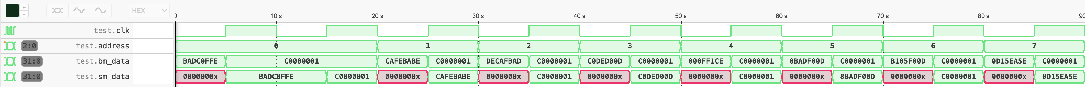 Instancie as duas memórias, concatenando-as, de forma que a saída da primeira seja fornecida à segunda, para que seu conteúdo seja copiado, conforme a figura. Forneça também o valor c0000001 para a primeira, de forma que todo o seu conteúdo seja sobrescrito por este valor ao longo do teste.